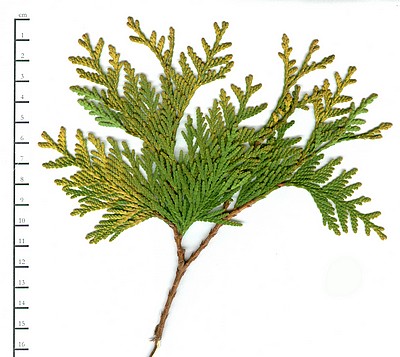Thuja occidentalis 'Malonyana Aurea', zaznamenal Petr Horáček, 2006.12Popis: barevný scan, líc (Botanická zahrada Praha Troja) (A11)