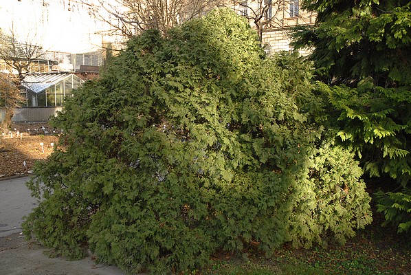Thuja occidentalis 'Umbraculifera', zaznamenal Petr Horáček, 2006.12.07Popis: habitus (Botanická zahrada UK Na Slupi) (A10)