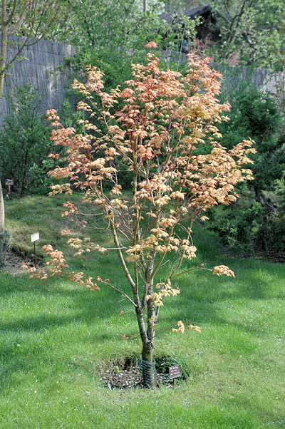Acer palmatum 'Coral Pink', zaznamenal Petr Horáček, 2005.04.29Popis: habitus (Botanická zahrada Praha Troja) (A11)